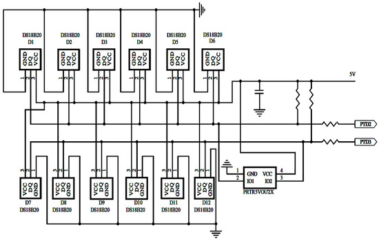 The accurate collection of the battery temperature is the premise of the thermal management of the battery. The DS18B20, a digital temperature sensor (produced by Dallas Semiconductor, Dallas, TX, USA) was selected to realize the temperature acquisition. It has the advantages of accurate acquisition, a wide range, a wide application, and so on []. The circuit diagram is shown in Figure 12. The temperature information collected by DS18B20 will be passed to the main control chip through two I/O interfaces of TMS320F2812, PTD2 and PTD3.In order to fully use the characteristics of DS18B20, twelve units were used, which were divided into two groups. Each one is attached to the surface of an individual cell so as to accurately collect the temperature information of each battery.