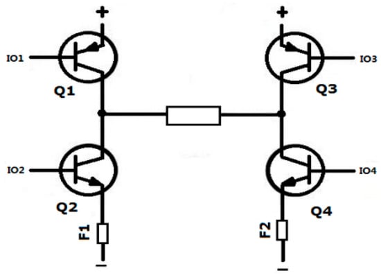 As shown in Figure 13, Q1 and Q3 are PNP triode; Q2 and Q4 are NPN triode. They are controlled by four GPIO driver ports of TMS320F2812. F1 and F2 are fuses to prevent the circuit from short circuit, and the middle of the block represents the thermoelectric sheets. The corresponding current direction is displayed in Table 4.