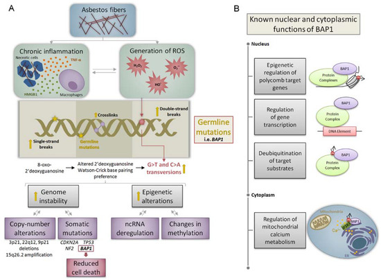 - Xu, J.; Kadariya, Y.; Cheung, M.; Pei, J.; Talarchek, J.; Sementino, E.; Tan, Y.; Menges, C.W.; Cai, K.Q.; Litwin, S.; et al. Germline mutation of Bap1 accelerates development of asbestos-induced malignant mesothelioma. Cancer Res. 2014, 74, 4388–4397. [Google Scholar] [CrossRef] [PubMed]