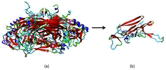Presently, protein design helps in the development of new drugs and medications. Any cells, especially from plants and animals, are engineered to express antibodies and proteins used in the treatment of several illnesses and conditions. To produce high quality and yield, it is necessary for the conditions of the engineered protein one to meet optimal values, especially in the biotechnology/biosensors field. The ultimate goal in protein design is to obtain a functional protein with a desired structure. The “structural” approach and the “functional” approach are directly used to engineer the protein. The first approach is based on the de novo design of secondary motifs [], which are assembled into tertiary structures stabilised by disulphide-bridge linkers. Meanwhile, the second approach is based on a particular function by grafting functional residues into a stable scaffold. In order to execute this process, basic information about the structure of the protein is needed. Thus, a combination of both approaches—structure-based along with the selection of the best template from the designed protein collection—can lead to the minimisation of the targeted protein []. Therefore, downsizing the native protein by removing unwanted regions can be a good strategy in protein mimicking.