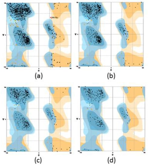 The Ramachandran plot for DAO and its domain. (a) AGAO, (b) native DAO, (c) domain 4 and (d) mini DAO.