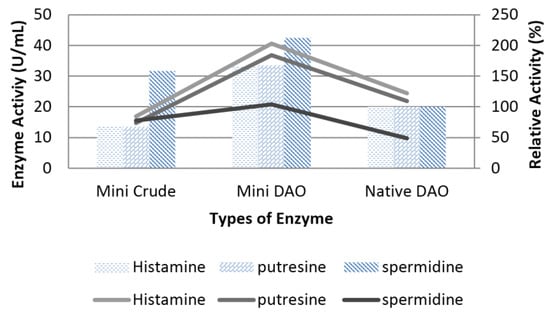 The recombinant mini DAO was purified using a Nickel-Sepharose HP column. The recombinant fraction containing soluble protein was applied to a 10 mL Nickel-Sepharose column (1.6 × 20 cm). This column had been previously equilibrated, with 50 mM potassium phosphate buffer (pH 7.4) that contained 0.5 M of sodium chloride, at the flow rate of 1 mL/min. The column-bound enzyme was washed with 50 mM potassium phosphate buffer (pH 7.4), containing 500 mM imidazole and 0.5 M sodium chloride. Elution was conducted with a linear gradient of imidazole (0–500 mM) in 50 mM potassium phosphate buffer (pH 7.4). The purified enzyme was subjected to peroxidase activity determination [].