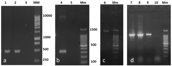 Identification of the histidine (hdc), ornithine (odc), and lysine (ldc) decarboxylase genes in the strains isolated from red octopus (Octopus maya). The hdc amplification of Hafnia alvei NR6B (1a) and Enterobacter NR73 (2a) was performed using the specific primer set 106/107 (534 bp); the primers JV16HC/JV17HC (367 bp) for Lactococcus NR6A (4b). Odc from Enterobacter NR73 (6c) was performed using the PUT1 primer set (1400 bp). Ldc from H. alvei NR6B (7d), Enterobacter NR73 (8d), and Lactococcus NR6A (9d) was amplified with the CAD1 primer set (1098 bp). Negative control = 3a, 5b, 10d; MM = 1 Kb DNA Ladder; Mm = DNA Ladder 100–1500 bp.