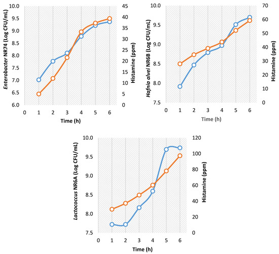 The concentration of histamine produced of the isolated strains in TSBH medium is shown in Figure 3. The histamine concentration was increased as a function of growth time. In the first six hours, the concentration of H. alvei NR6B, Lactococcus NR6A, and Enterobacter NR74 attained up to 9.0–10.5 log CFU/mL, but the production of histamine was variable. The highest histamine concentration was produced by Lactococcus NR6A reaching 100 ppm at 6 h of growth. H. alvei NR6B produced 60 ppm in the same time and Enterobacter NR74 reached less than 40 ppm in 6 h of growth.