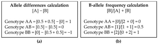 CEL files are analyzed using the Chromosome Analysis Suite (ChAS) software (Thermo Fisher Scientific, Inc) and converted to CYCHP files containing information on copy number, loss of heterozygosity (LOH), mosaicism, and genotype calls. Copy number state and SNP genotypes are called using the Hidden Markov Model (HMM) algorithm and the Bayesian Robust Linear Model with the Mahalanobis distance classifier (BRLMM) algorithm, respectively. The intensity ratio of each SNP and CN probe in the DNA test provide a relative copy number (log2 ratio: log2sample − log2reference) which is normalized respect to a reference. The Reference Model File contains 380 samples, 284 from HapMap and 96 from BioServe Biotechnologies (BioServe Biotechnologies, Ldt; Beltsville, MD, USA). Determination of log2 ratio will indicate if there is a gain or loss of genetic material. The alleles corresponding to the nucleotide base change are given the designation of allele A and allele B; SNP genotypes are visualized using both the allele difference plot and the B-allele frequency plot (BAF). The allele difference is calculated as the difference between the number of the two alleles using the formula [A] − [B]. Each allele has a value of 0.5. B-allele frequency is the number of the B alleles divided by the total number of alleles of a SNP (AA, BB or AB) and is calculated with the formula: [B]/[A] + [B]. Genotype value calculations for both type of plots are shown in Figure 2.