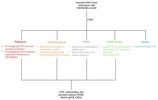 - Miller, D.T.; Adam, M.P.; Aradhya, S.; Biesecker, L.G.; Brothman, A.R.; Carter, N.P.; Church, D.M.; Crolla, J.A.; Eichler, E.E.; Epstein, C.J.; et al. Consensus statement: Chromosomal microarray is a first-tier clinical diagnostic test for individuals with developmental disabilities or congenital anomalies. Am. J. Hum. Genet. 2010, 86, 749–764. [Google Scholar] [CrossRef] [PubMed]