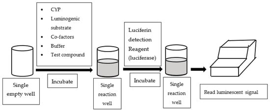 An alternative assay configured in multi-well plates is to measure luminescent readings to quantify CYP enzyme activities. Luminescence-based CYP assays employ derivatives of luciferin as CYP probe substrates, which are luminogenic [33]. In essence, the luminogenic probe substrates are metabolized by CYP to luciferin, which subsequently reacts with luciferase and produces luminescent light (See Figure 3). Most of the luminescence-based CYP assays available in literature utilized P450-GloTM assay kits supplied by Promaga Corporation (Madison, WI, USA).