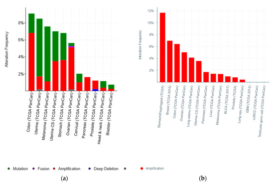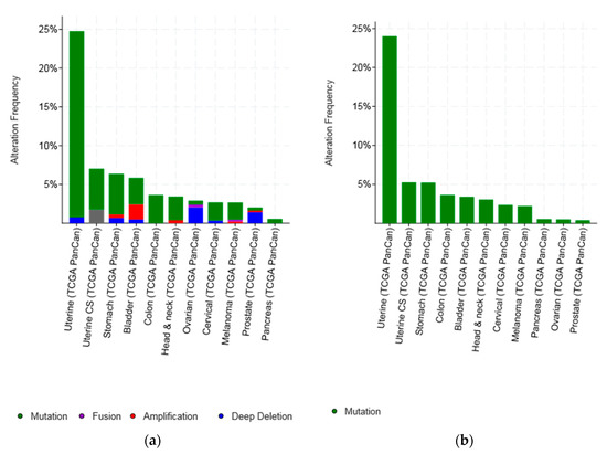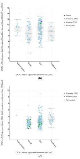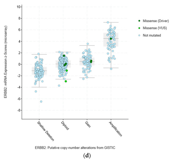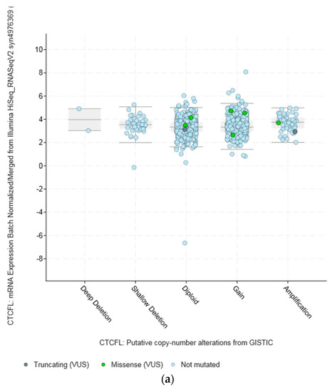 - Cerami, E.; Gao, J.; Dogrusoz, U.; Gross, B.E.; Sumer, S.O.; Aksoy, B.A.; Jacobsen, A.; Byrne, C.J.; Heuer, M.L.; Larsson, E.; et al. The cBio Cancer Genomics Portal: An open platform for exploring multidimensional cancer genomics data. Cancer Discov. 2012, 2, 401–404. [Google Scholar] [CrossRef] [PubMed] [Green Version]