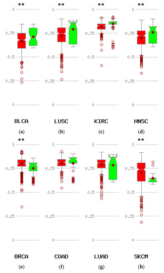 - Cancer Genome Atlas Research Network. Comprehensive molecular characterization of clear cell renal cell carcinoma. Nature 2013, 499, 43–49. [Google Scholar] [CrossRef] [PubMed] [Green Version]