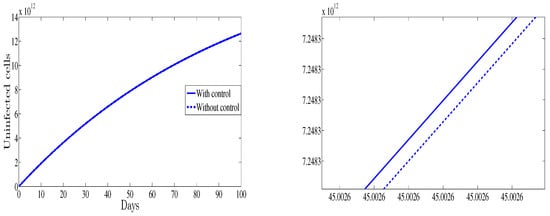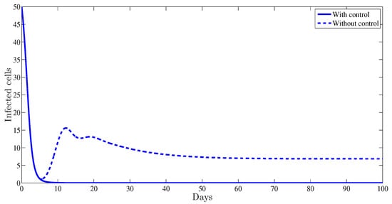 From Figure 2, one can observe that the plot representing the infected cells with control strategy converges towards , however without any control therapy it converges towards , which proves that administrating this treatment will help the patient by a significant reduction of the infected cells.