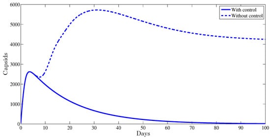 Figure 3 illustrates the evolution of the capsids during the period of observation. It was established that with a control strategy, the amount of capsids vanishes after the first weeks of the administrated therapy. Meanwhile, without any control strategy this number remains at very high positive level, .