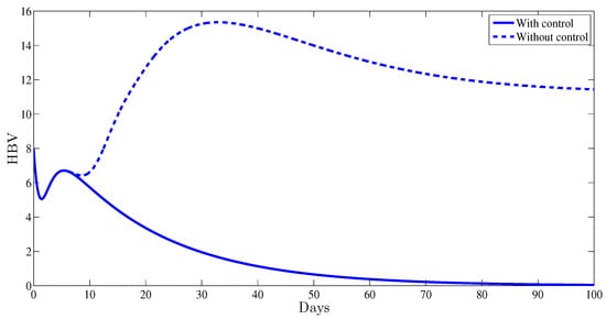 The role of the two administrated therapy controls is also remarked in Figure 4. It was shown that with therapy control, the number of virions dies out after the first weeks of therapy, while without any control strategy it remains equal to . This indicates clearly the impact of the administrated therapy in controlling the HBV viral replication.