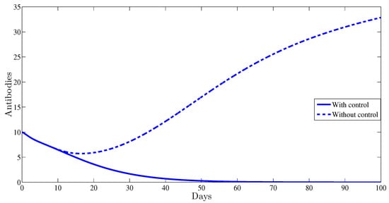 The antibody immune response is clearly affected by the control. This is illustrated in Figure 5; indeed, with control, the curve of antibodies converges towards zero; however, without any control strategy it converges towards which clearly indicates the importance of adding the antibody component to HBV viral dynamics.