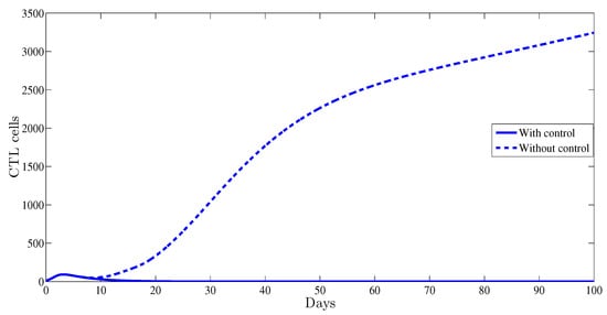 The CTL cell dynamics are also affected by the optimal control. This is shown in Figure 6; indeed, with control, the curve of CTL cells converges towards zero; however, without any control it converges towards a high level of ; this reveals the role of the CTL component in blocking HBV viral infection.