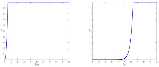 The two optimal controls and representing inhibiting new infections and blocking viral replication are represented in Figure 7. The two curves present the treatment administration schedule for the period of observation. Both of the controls start from zero and when the first immune boosting drug is administered at full scale, the second drug is at its lowest for the first days of observation. During the last days of observation both the therapies should be administrated at their full scales. In this case the new infection is totally blocked. It is worthy to notice that if we compare the numerical simulation of this paper and the recent work [], we remark that the antibodies have a clear effect in maximizing the level of the healthy cells and reducing the amount of the free viruses. Also, we remark that the presence of antibodies improves the effectiveness of both treatments after the first 60 days by reaching their maximum value. However, without antibodies, only the second treatment presents efficacy (see []) which leads to the elimination of HBV viruses. The obtained numerical results show that with antibodies and the optimal control, we observe a significant reduce of the HBV infection. All our numerical simulations will performed during the acute HBV infection period. This period is also known as the early stage of the infection [,]; however it will be very useful to predict infection for a chronic type of the infection.