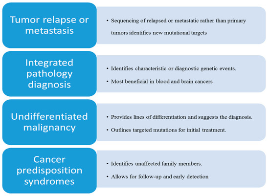 In a rising number of cases, the treatment challenge stems from difficulties in classifying certain cancers that manifest with unusual or rare, non-characteristic morphology. Most often such cancers are labeled as undifferentiated malignancy or undifferentiated sarcoma after extensive histopathologic and immunophenotypic analysis. Undifferentiated sarcoma is commonly diagnosed when a soft-tissue tumor has no identifiable line of differentiation. These tumors represent a heterogeneous group of mesenchymal tumors with variable morphology that include spindle cell, pleomorphic, round cell, and epithelioid tumor variants. Undifferentiated sarcomas in children have variable outcomes and it is not possible to tailor the treatment to a specific disease type. In such patients, the routine use of NGS could increase diagnostic accuracy by determining the cell type of origin, identify molecularly-targeted therapies to try, and provide support for the use of other interventions, such as surgical resection and/or radiation therapy. Furthermore, it may help to better understand the patient’s prognosis for cure [32]. In the case of undifferentiated malignancies, early use of NGS can replace or decrease the number of other ancillary tests that are often requested during the processing of these tumors.