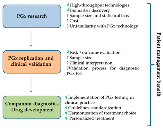 Technologic advances in PGx discovery have accelerated the translation of new biomarkers in clinical practice for patient’s stratification according to the genetic background, in order to achieve better treatment outcomes and safety. In the era of precision medicine, until now, many patients do not respond appropriately to therapy or might not be treated fittingly or might suffer delays in therapy shift or withdrawal because of lack of drug efficacy or ADRs. The unpredictable patient’s response to a given therapeutic regimen till represents a significant safety risk. The possibility to prevent such reactions by PGx derived tools is a good chance in terms of lowering health care costs, improve disease management and patient’s outcome. Biomarker testing may also be useful for predicting drug interactions during poly-therapies, and 20–25% of drugs are in part metabolized by cytochrome P450 2D6 (CYP2D6). CYP2D6 is a highly polymorphic phase 1 gene, mostly non-inducible, but which can be inhibited by many drugs given simultaneously, resulting in poor, intermediate, efficient or ultra-rapid metabolizer (UMs) patient phenotype which condition PK of its substrate drugs [30,38,39]. The testing of tumor tissue bio-markers in cancer clinical care decision making have changed the paradigm of cancer treatment of and they are mandatory in several treatment guidelines for precision oncology [40,41,42,43]. No similar landscape can be presently depicted for PGx biomarkers.