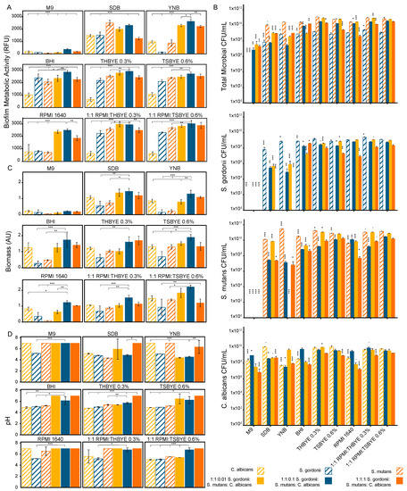 Mono-species and multispecies biofilm growth in different media assessed at 24 h, by (A) metabolic activity assay, (B) viability, (C) biomass, and (D) cariogenic potential assay. The biofilms were grown in M9, SDB, YNB, BHI, THBYE 0.3%, TSBYE 0.6%, RPMI 1640, 1:1 v/v RPMI 1640:THBYE 0.3%, and 1:1 v/v RPMI 1640:TSBYE 0.6% in 96-well microtiter plates for 24 h. The metabolic activity was measured by PrestoBlue® fluorescence (RFU, n = 6). The viability was determined using colony forming units per milliliter (CFU/mL, n = 3). The total microbial counts and S. gordonii counts were performed using TSAYE 0.6% plates, the S. mutans counts were performed using TYS20B + 0.01% TTC agar plates, and the C. albicans counts were performed using Sabouraud Modified agar plates. The biofilm biomass was measured using crystal violet staining absorbance (AU, n = 3). The biofilm cariogenic potential was determined using Bromocresol Green pH sensitive dye absorbance (n = 6). For parts A, C, and D, the statistical significance was compared to the 1:1:0.1 biofilm growth in each media type, with p-values < 0.001 (***), 0.01 (**), or 0.05 (*). For part B, the significance was compared to the microorganism growth in 1:1 v/v RPMI 1640:TSBYE 0.6% media for each biofilm type. All error bars are the standard deviation.