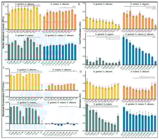 Assessment of the inoculum concentrations on the biofilm growth in 1:1 v/v RPMI 1640:TSBYE 0.6% media at 24 hours by (A,B) metabolic activity assays, (C) viability, and (D) biomass. The inoculum concentrations are expressed as ratios of Streptococci: Candida, S. gordonii: S. mutans, or S. gordonii: S. mutans: C. albicans. All data are normalized to the 1:0 or 1:1:0 ratios. The metabolic activity was measured either by (A) PrestoBlue® fluorescence (RFU) or (B) XTT reduction absorbance (AU). The viability was determined using colony forming units per milliliter (CFU/mL). The total microbial counts on TSAYE 0.6% plates are shown. The biofilm biomass was measured using crystal violet staining absorbance (AU). The statistical significance is compared to the 1:0 or 1:1:0 ratios, with p-values < 0.001 (***), 0.01 (**), or 0.05 (*). All error bars are the standard deviation (n = 3).
