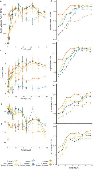Assessment of the mono- and multispecies biofilm growth over 48 hours in 1:1 v/v RPMI 1640:TSBYE 0.6% media by (A) metabolic activity assay, (B) viability, (C) biomass, and (D) cariogenic potential assay. The metabolic activity was measured by PrestoBlue® fluorescence (RFU, n = 6). The viability was determined using colony forming units per milliliter (CFU/mL, n = 3). The total microbial counts and S. gordonii counts were performed using TSAYE 0.6% plates, the S. mutans counts were performed using TYS20B + 0.01% TTC agar plates, and the C. albicans counts were performed using Sabouraud Modified agar plates. The biofilm biomass was measured using crystal violet staining absorbance (AU, n = 3). The biofilm cariogenic potential was determined using Bromocresol Green pH sensitive dye absorbance (n = 6). All error bars are the standard deviation.