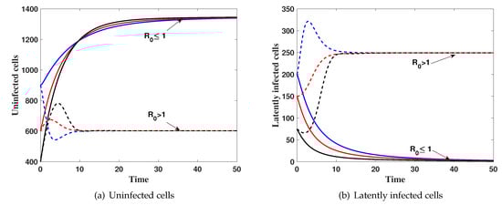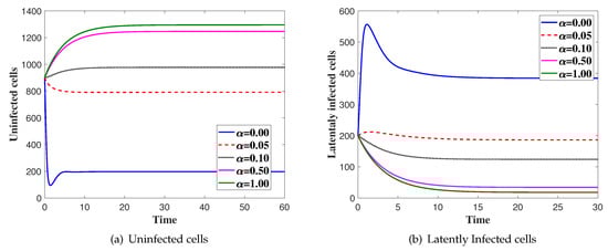 In this subsection, we show the effect of the presence of latently infected cells on virus dynamics. Let us incorporate an antiviral drug with efficacy where . The virus dynamics model (9)–(13) under the effect of treatment is given by: