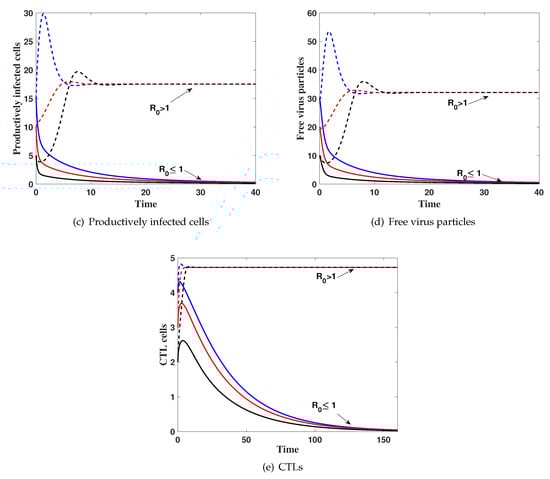 Models (1)–(4) have three steady states; disease-free steady state endemic steady state without a CTL immune response and endemic steady state with a CTL immune response . Moreover, the existence and stability of the steady states are determined by two threshold parameters, the basic reproduction number (which determines whether or not the disease will progress) and the CTL immune response activation number (which determines whether or not a persistent CTL immune response can be established), where