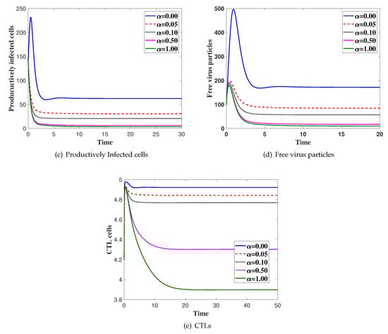 In this case, we fix and is changed. We solve the system numerically with the initial condition IC4. In Figure 2, we show the effect of saturated incidence parameter . We can see that the concentration of the uninfected cells is increased as is increased. Moreover, the concentration of latently infected cells, productively infected, viruses and CTLs are decreased as is increased.