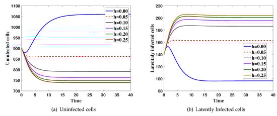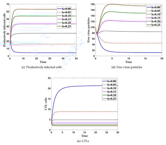 Here, we fix and h is changed. The system is solved with initial condition IC5, Figure 3 shows that the increasing of h will increase both and and decrease all of , and .
