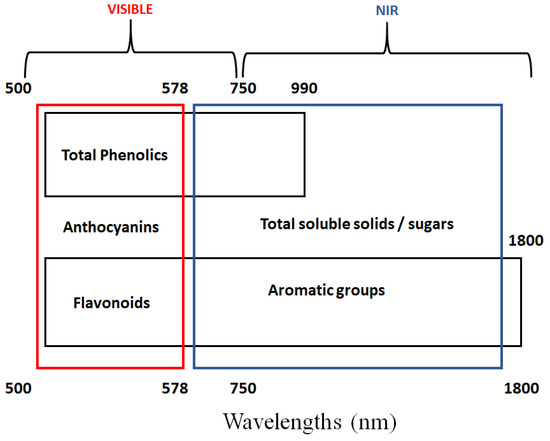 Zhang and co-authors collected NIR HYPER images during the ripening of grape samples to predict phenolic content [29]. Several algorithms were used, such as PCR, PLS, and support vector regression (SVR), to predict the TPhenol content in both grape berry and seed samples based on NIR HYPER images [29]. The authors, reported R2 and RMSEP values of 0.89 and 0.11 g L−1 for (+)-catechin equivalents (CE) for TAN in skins, 0.91 and 0.17 (g L−1 CE) for total iron-reactive phenolics (TIRP) in skins, 0.87 and 0.14 (g L−1 M3G) for Antho in skins, 0.92 and 0.24 (g L−1 CE) for TAN in seeds, and 0.87 and 0.51 (g L−1 CE) for TIRP in seeds, respectively [29]. Figure 2 summarises the main wavelengths in the visible and near infrared relevant to the prediction of chemical compounds in grapes, as reported by different authors.