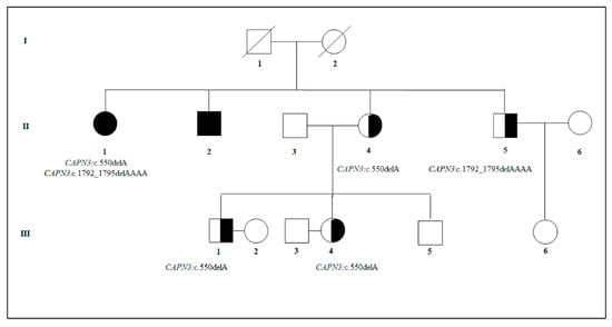 Pedigree showing the segregation of the Calpain 3 (CAPN3)_c.550delA and CAPN3_c.1792_1795delAAAA mutations within the family.
