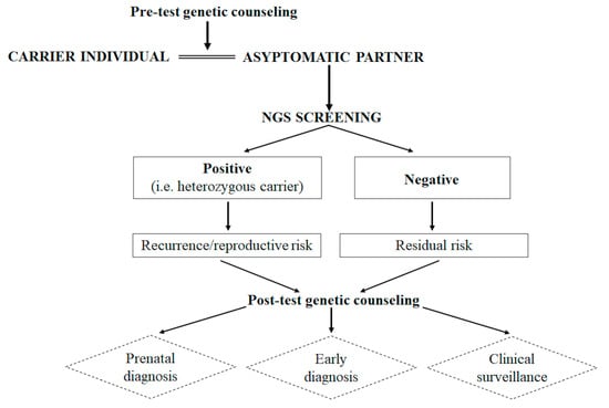 Overall, this study highlighted the importance of providing a genetic counseling/testing service even in unaffected individuals with a carrier partner. Such an approach is helpful for genetic counselors, and can provide a more accurate reproductive/recurrence risk estimation and eventually, suggest the possibility of prenatal testing, early diagnosis or other medical surveillance strategies (Figure 2). Finally, it is important to point out that the clinical significance of genetic counseling does not involve only the single patient, but it also affects born and unborn family members. In this regard, genetic counselors should pay attention to all the possible outcomes and implications of a genetic test at the familial level and thereby provide an accurate genetic counseling.