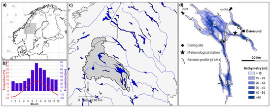 Lake Storsjön is located in central Sweden (63.12° N, 14.37° E; Figure 1a). Average annual temperature at the Frösön meteorological station, located on an island in the lake, is 2.5 °C, with average monthly temperatures ranging from −8.6 °C in January to 13.4 °C in July. The average annual precipitation is 491 mm, with >50% falling between June and September (Figure 1b; all values refer to the 1960–1990 reference period). The surrounding bedrock is mainly composed of greywackes, shales and limestones of Cambro-Silurian age, partly altered by the Caledonian orogeny, covered by a Quaternary clayey diamicton [44]. The catchment area of about 12,000 km2 extends from the water divide of the Scandes Mountains at a maximum elevation of 1796 m to the outlet of the lake at 292 m a.s.l. (Figure 1c). It is dominated by coniferous forest (40%) and mires, with some cultivated areas on the clay-rich soils on carbonate bedrock. Lake Storsjön itself covers an area of 456 km2, with 13% of the catchment area consisting of lakes.