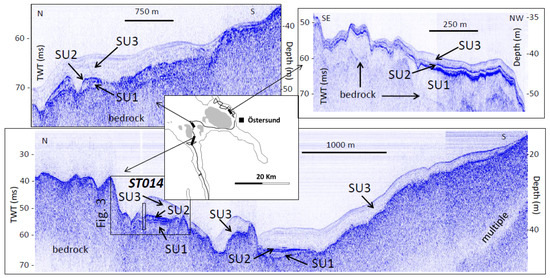 Selected examples of acoustic facies identified on seismic profiles (bold black lines on the map), highlighting the complex morphology of the bedrock and variable successions of seismic units (SU1, SU2 and SU3) across the lake basin. The locations of the coring site (STO14) and Figure 3 are indicated on the bottom panel.