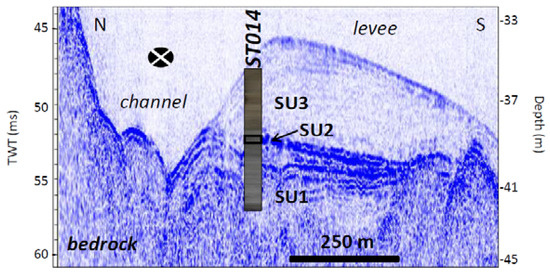 Detail of a seismic profile indicating the correlation of acoustic facies and sedimentary facies from the STO14 sediment sequence as described in supplementary Figure S1. The location of this profile is indicated in Figure 2.