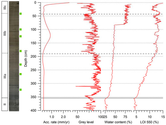 Division of lithological units of the STO14 sediment sequence, composite photograph of the sediments sequence, depths of radiocarbon dates (green squares), accumulation rate, grey level of the photograph, water content and organic matter content (LOI). The abrupt change in water content reflects the different coring techniques (freeze core above 80 cm, piston cores below 80 cm), as there is some water loss from the piston cores during storage and sampling.