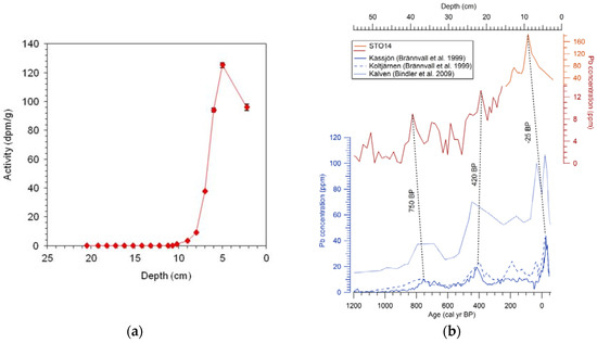 Pb concentration peaks in lake sediments can be linked to well-dated events of anthropogenic Pb emissions and widespread, airborne pollution, e.g., at ca. 750 and 420 cal yr BP due to intensified metallurgy in Europe and around ‒25 cal yr BP due to the use and subsequent ban of leaded petrol [62,63]. The ‒25 cal yr BP peak can be clearly identified in the STO14 sequence. Two other Pb peaks are interpreted to reflect the 750 and 420 cal yr BP increases in anthropogenic Pb, which have also been identified in other Swedish lakes [53,64] (Figure 6b). Although these Pb peaks are not very distinct in the STO14 sediment sequence, the inferred dates are in good agreement with adjacent 14C and 137Cs dates.