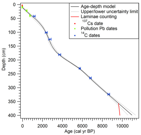 The age-depth model for the sediment sequence was created with Clam version 2.2 [56] using a smoothing spline with a smooth level of 0.3, including seven 14C dates, three pollution Pb dates and one 137Cs date (210Pb dating was not possible due to insufficient sample sizes). The sampling year 2014 (−64 cal yr BP) was assigned to the top of the composite profile.
