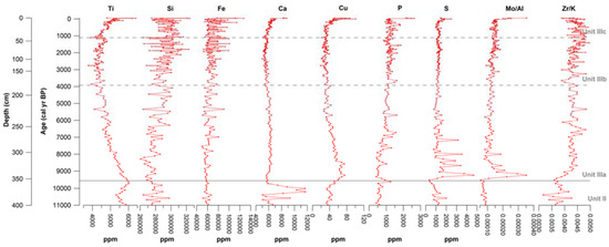 Concentrations of Ti (Figure 8) and other lithogenic elements (Zr, Rb, K and Al; not shown) display largely similar patterns throughout the sediment sequence, with high values in Unit II (prior to 9500 cal yr BP), a constant decrease throughout Unit IIIa (to about 4000 cal yr BP), low values in Unit IIIb (between 4000 and 1100 cal yr BP) and an increase throughout Unit IIIc (from ca. 1100 cal yr BP to present). The average correlation between the lithogenic elements is 0.90 (p < 0.001) and they are all negatively correlated with organic matter contents (r = −0.82; p < 0.001). Si concentrations are not strongly correlated with the lithogenic elements (r = −25; p < 0.05), indicating that rather than clastic input, Si reflects diatom productivity [67]. Ca concentrations are highly variable in Unit II and reach up to 12,000 ppm. There is relatively little variation in Unit IIIa, with concentrations around 6100 ppm. In Unit IIIb concentrations are even lower (5500 ppm on average) until they increase again throughout Unit IIIc (Figure 8). Ca concentrations are negatively correlated with organic matter content (r = −0.40) and positively correlated with the lithogenic elements (mean r = 0.51). The transition from Unit II to III is also characterized by elevated Zr/K ratios (Figure 8), pointing to a coarser grain size [68], as well as by an increase in the water content of the sediments (Figure 5). Mo/Al ratios are low throughout Unit II, indicating oxic conditions at the sediment-water interface [69,70], then increase abruptly at the Unit II-III transition, followed by several minor peaks. From ca. 8000 cal yr BP onward, Mo/Al ratios increase slowly and steadily until another peak is reached at the top of the sediment sequence. S concentrations show similar patterns and are significantly correlated with Mo/Al ratios (r = 0.59; p < 0.001).