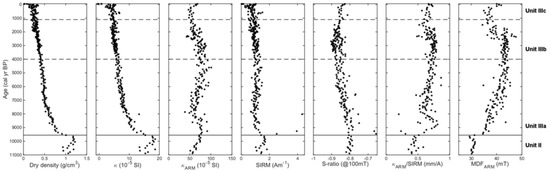 The ratio of κARM to SIRM, often used as a grain-size indicator [72,73], varies between ca. 0.4 and 0.8 mm/A. The lowest values, corresponding to coarser magnetic grain sizes, are observed in Unit II while Unit III is characterized by generally smaller magnetic grain sizes. MDFARM, which is a coercivity sensitive parameter, shows a sharp increase at the boundary between Unit II and Unit III and then gradually increases up to 45 mT in Unit IIIb, indicative of the presence of bacterial magnetite [74]. Overall the κARM/SIRM and MDFARM values are consistent with a simple system consisting of a mixture two end-members as defined by [74]: (i) a detrital component (κARM/SIRM ≈ 0.5 mm/A, MDFARM ≈ 30 mT), which is essentially Unit II; and (ii) a soft biogenic component (κARM/SIRM > 0.8 mm/A, MDFARM ≈ 45 mT) that becomes gradually more important in Unit IIIa and Unit IIIb. In Unit IIIc there is a relative increase in the contribution of the detrital component again. High values of κARM/SIRM in the lower part of Unit IIIa are not satisfactorily explained by this simple model and could potentially indicate the presence of a third magnetic component (e.g., greigite, see above).