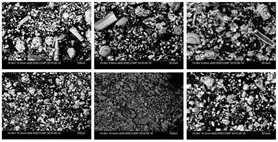 The three black layer samples and the three background gyttja samples examined by SEM each showed similar characteristics. Black layers are composed of dominantly minerogenic particles and aggregates, whereas the clay gyttja contains more autochthonous biogenic material, e.g., diatoms (Figure 10). The Storsjön sediments are generally fine-grained with ca. 95 weight % belonging to the silt and clay fractions. The black layers are characterized by a slightly larger grain size than the clay gyttja (Figure 11). The grain size proxy Zr/K [68] also indicates a larger average grain size of the black layers compared to bulk sediment samples (Figure 11).