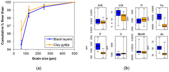 (a) Grain size distributions of six black layer and six clay gyttja samples sieved with 500, 250, 125 and 63 µm meshes. Error bars indicate the range of values for each grain size class. (b) Element concentrations and ratios as well as organic matter content (LOI) of 14 pairs of black layer (blue) and surrounding bulk sediment samples (orange) between 20 and 354 cm depth. This interval was chosen to exclude Unit II, which has no black layers and to exclude the uppermost part of the sediment sequence, which is characterized by prominent peaks in many elements due to anthropogenic impact. The black horizontal lines represent the medians, the bottom and top of the boxes the lower and upper quartiles, respectively. The whiskers extend to the minimum and maximum values.