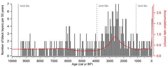 The frequency of occurrence of the 335 black layers is variable throughout the sediment sequence (Figure 12). There is a slight increase around 6000 cal yr BP and a marked augmentation between 3600 and 1800 cal yr BP, with a peak around 2600 cal yr BP. The second increase is also characterized by a clear increase in sediment accumulation rate (Figure 12). Throughout the sediment sequence the average thickness of the black layers does not vary significantly.