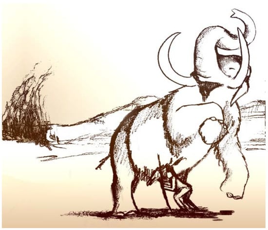 Another elephant hunt procedure, performed by a single spear-wielding hunter, is described by Janmart [134] regarding the pygmies of the Ituri forest (Congo). According to Janmart, “the hunter sneaks underneath the standing elephant and thrusts the spear upward into its soft belly with a lightning-quick movement” [134] (p. 146). He then immediately slips out from underneath the elephant, taking advantage of the elephant’s momentary confusion. If the hunter has enough time, he adds another jerk to the lance, enlarging the wound (see Figure 2). A similar strategy is later described by Duffy [50] (p. 156) regarding the same group. Several cases of elephants killing people have been noted in the literature, usually during hunting ([50] (p. 143) [135], demonstrating the danger involved in approaching these huge animals.