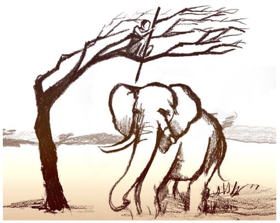 Wood describes another method using a spear, which involves one hunter, equipped with a heavy spear and some rope [81] (p. 498). The hunter attaches heavy stones to the shaft of the spear. He then ties one end of the rope to the spear and selects a suitable tree to climb. When an elephant passes underneath, the hunter drops the weighted spear and it starts to cut its way deeper into the animal’s vital organs, until it dies from loss of blood.