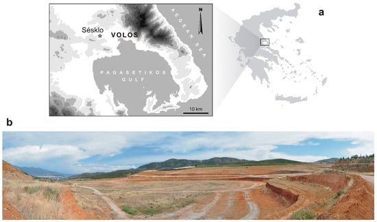 (a) Map of Greece, indicating the geographic location of the Sésklo locality (asterisk), west of the city of Vólos. Locality coordinates: 39.368° N, 22.851° E (WGS84 datum). Contour interval: 200 m. (b) Panoramic view of the clay pit seen from the North.