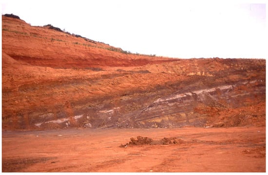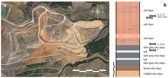 The locality of Sésklo is situated within a fluvial basin filled mainly with red-clay sediments (Figure 1b and Figure 2b). The basement of the basin is formed of metamorphic rocks (peridotites, serpentinites and slates with marble and ophiolite intercalations) that tectonically overlie a formation of Jurassic slates and Triassic–Jurassic marbles. The clastic filling of the basin consists mainly of fine-grained clays, deposited in strata of various thicknesses and not well-defined contacts among them [,]. The whole series exhibits a general dip of 11° towards the east-south east, so the western part of the quarry is expected to expose older layers. No major unconformity is observed in the clastic series; the strata continuity is, though, interrupted by numerous faults of generally small slip. Intercalations or lenses of coarser material are often found among the clayey deposits, indicating high-energy episodes in a generally low-energy fluvial milieu (Figure 2b). Lithologically, the red clays are very uniform, as most of the series consists of red-coloured clayey layers. The lowermost layers of the basin differentiate, however, from the dominant red clay sedimentary fill in being very dark coloured (Figure 2b and Figure 3). The colour is due to the high pyroclastic content of these layers, which according to Müller [] and Mastoras [] may have derived from a local volcanic centre. These layers, together with two intercalating tuff horizons, have not been visible or accessible for many years until today due to the quarry development, which otherwise has made it possible to access a sufficient part of the stratigraphic sequence and its faunal content.