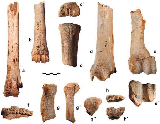 Fossil specimens from the lower level of Sésklo: (a) Struthio cf. chersonensis, left tarsometatarsus, SE2-1, dorsal view; (b) Gazellospira torticornis, left metacarpal III–IV, SE2-7, dorsal view; (c) Bovini indet., left proximal metacarpal III–IV, Σ-1390, dorsal view; (c’) idem, proximal view; (d) Bovini indet., right distal tibia, SE2-6, dorsal view; (e) Bovini indet., left distal humerus, SE2-5, cranial view; (e’) idem, distal view; (f) Gazella cf. bouvrainae, right maxilla with P3–M3, SE2-21, occlusal view; (g) Stephanorhinus sp., right metacarpal IV, Σ-1052, palmar view; (g’) idem, medial view; (g’’) idem, proximal view; (h) Sus arvernensis, left dentary with p4–m1, Σ-1391, occlusal view; (h’) idem, lingual view. Graphical scale in cm.