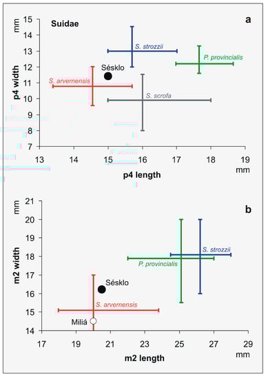 Comparison of the dental dimensions (in mm) of the Sus arvernensis dentary part Σ-1391 from Sésklo to the published metrical ranges of the fourth premolar (a) and the second molar (b) of Sus arvernensis, Sus strozzii, Propotamochoerus provincialis and Sus scrofa. The m2 from Miliá plots metrically close to the Sésklo specimen. Original data on species ranges and the Miliá specimen taken from [,,,].