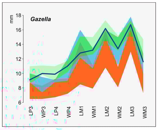 Comparison of the dental dimensions (in mm) of Gazella cf. bouvrainae from Sésklo SE2 (upper tooth row SE2-21, blue line) to the dimensional ranges of the large sample of Gazella borbonica from La Puebla de Valverde, Spain (orange area, original data according to []), which essentially also include the ranges of El Rincón, Spain [] and Saint-Vallier, France ([] and personal data). The measurement range of upper teeth from the Sésklo old collections referred to Gazella sp. (sky blue area, data according to []) and the type material of G. bouvrainae from Gerakaroú, Greece (green area, data according to []), are also plotted.