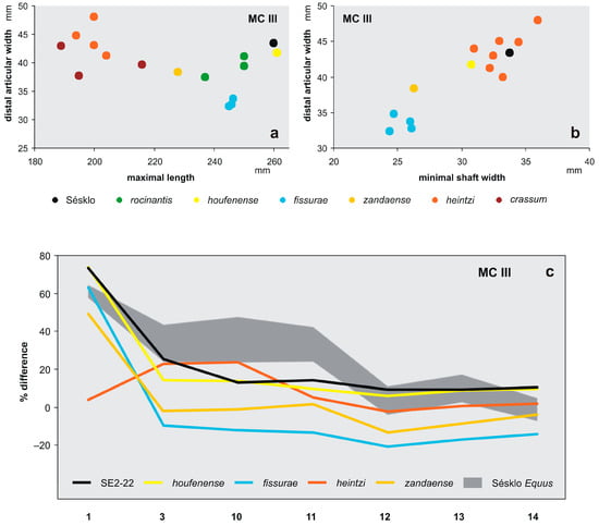 The morphology of the Sésklo specimen is very similar to that of Stephanorhinus megarhinus (Christol, 1834) from Montpellier [] (p. 513), but it is metrically smaller, comparable to S. jeanvireti (Guérin, 1972) [] (p. 514). The single available rhinocerotid find is certainly insufficient for a specific attribution. The family is scarcely represented in Sésklo; it is also known by a few, mainly autopodial specimens from the upper level of the locality referred to Stephanorhinus sp. as well [] (pp. 270–273). It is yet unknown if the finds are attributable to a single species in both levels.